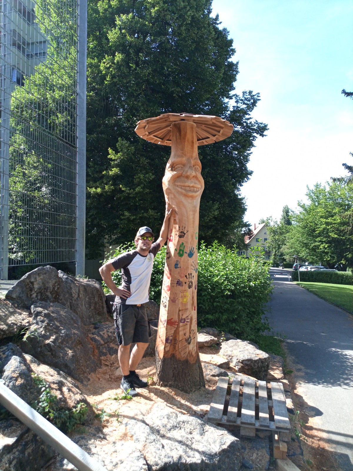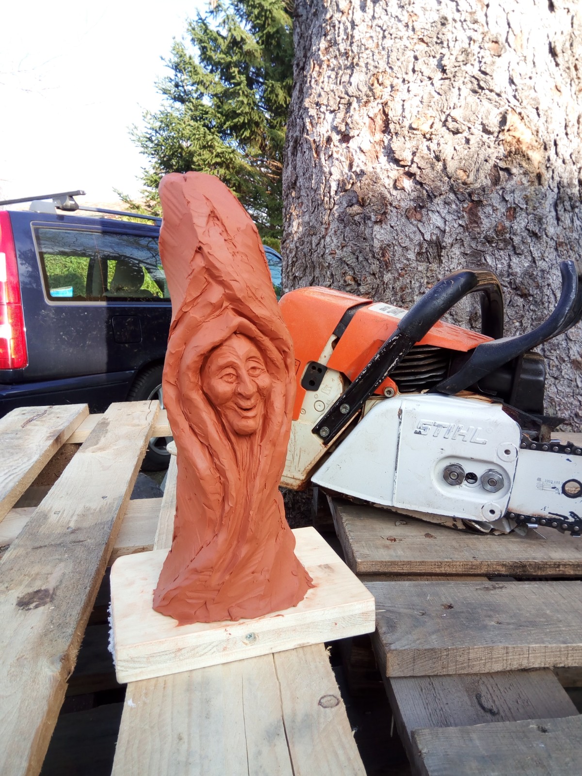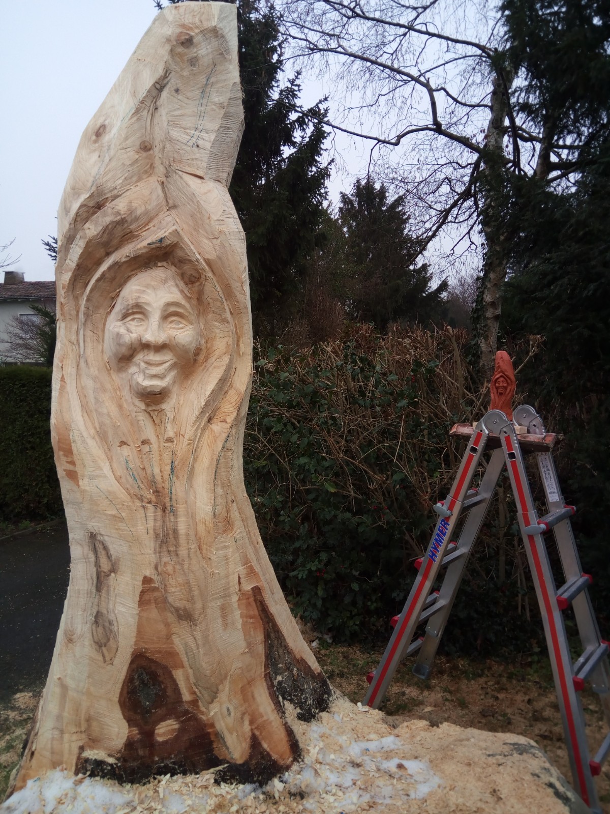 In einem Garten stand eine grosse alte Fichte, sie musste aus Sicherheitsgründen gefällt werden. Da die Eigentümer den Baum gemocht haben, entschieden sie sich aus dem dicken Stamm eine Skulptur erstellen zu lassen. Die Idee für ein „Baumorakel“ kam vom Kunden, ich habe ihr jedoch Gestalt verliehen.