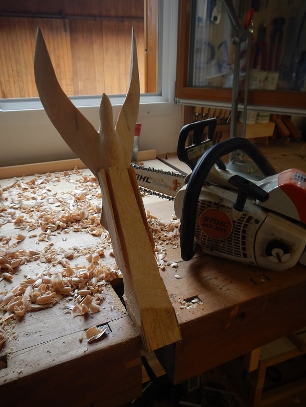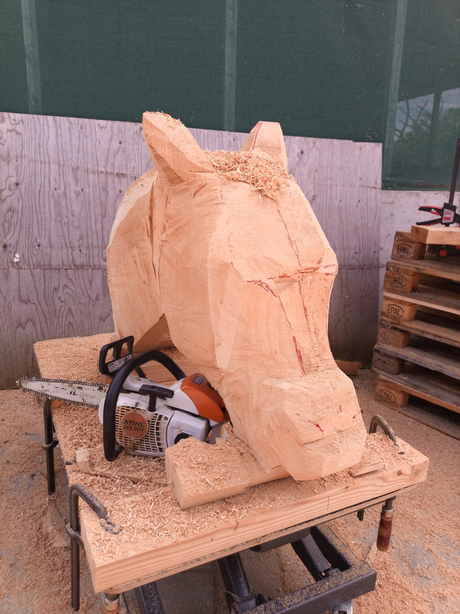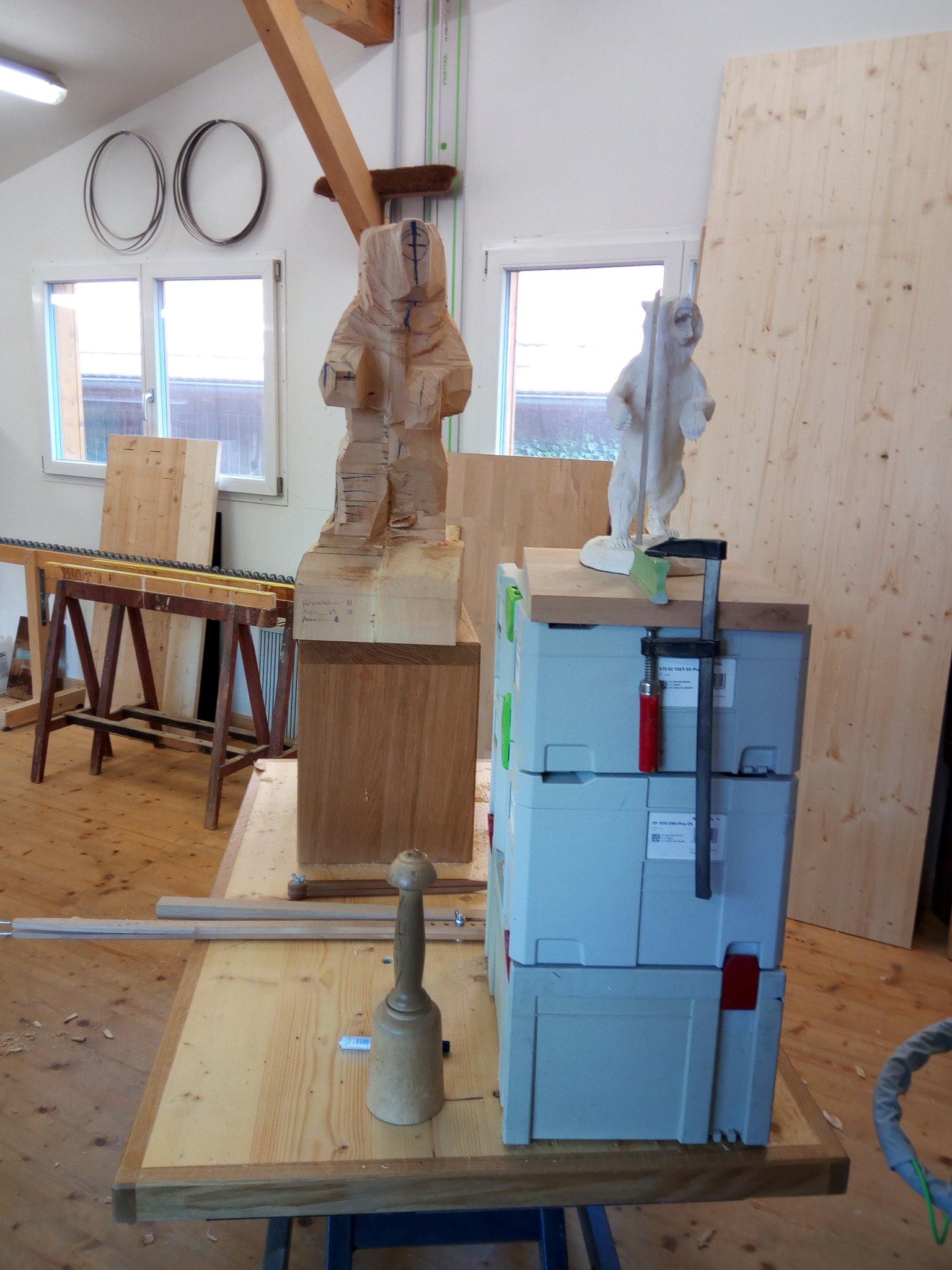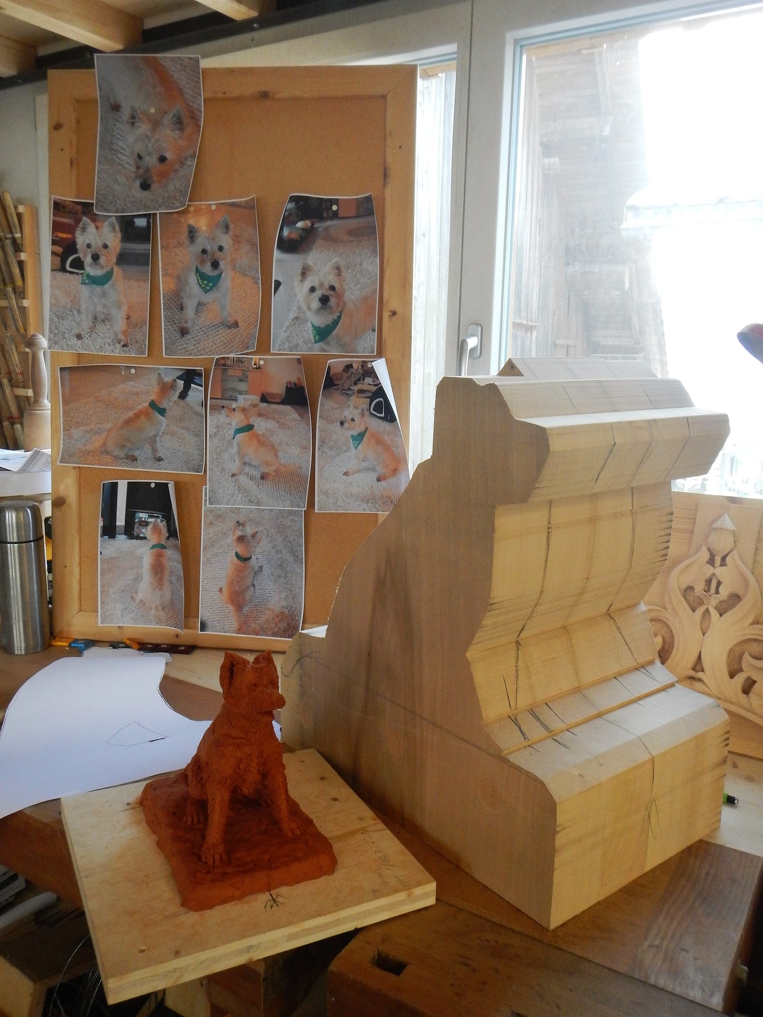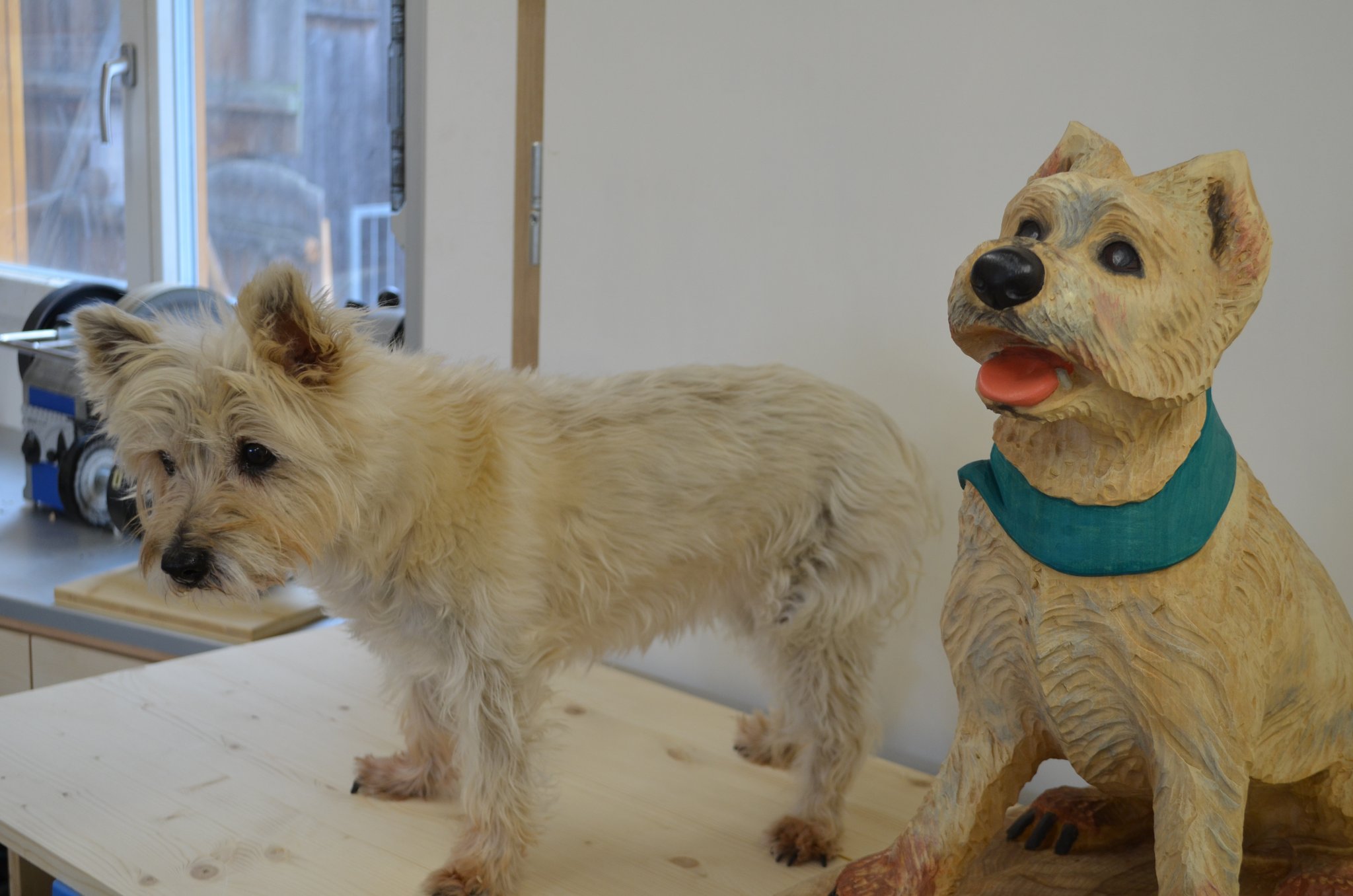 Der Lieblingshund der Kunden ist schon alt. In Erinnerung an ihren Liebsten, durfte ich ein Portrait in Lebensgrösse des Cairn Terrier erstellen. Anhand einer ersten Skizze und eines anschliessenden kleinen Models, bestimmten wir die Pose des Hundes. Mithilfe von Kettensäge und Schnitzmeissel habe ich ihn dann aus einem Lindenklotz gehauen.