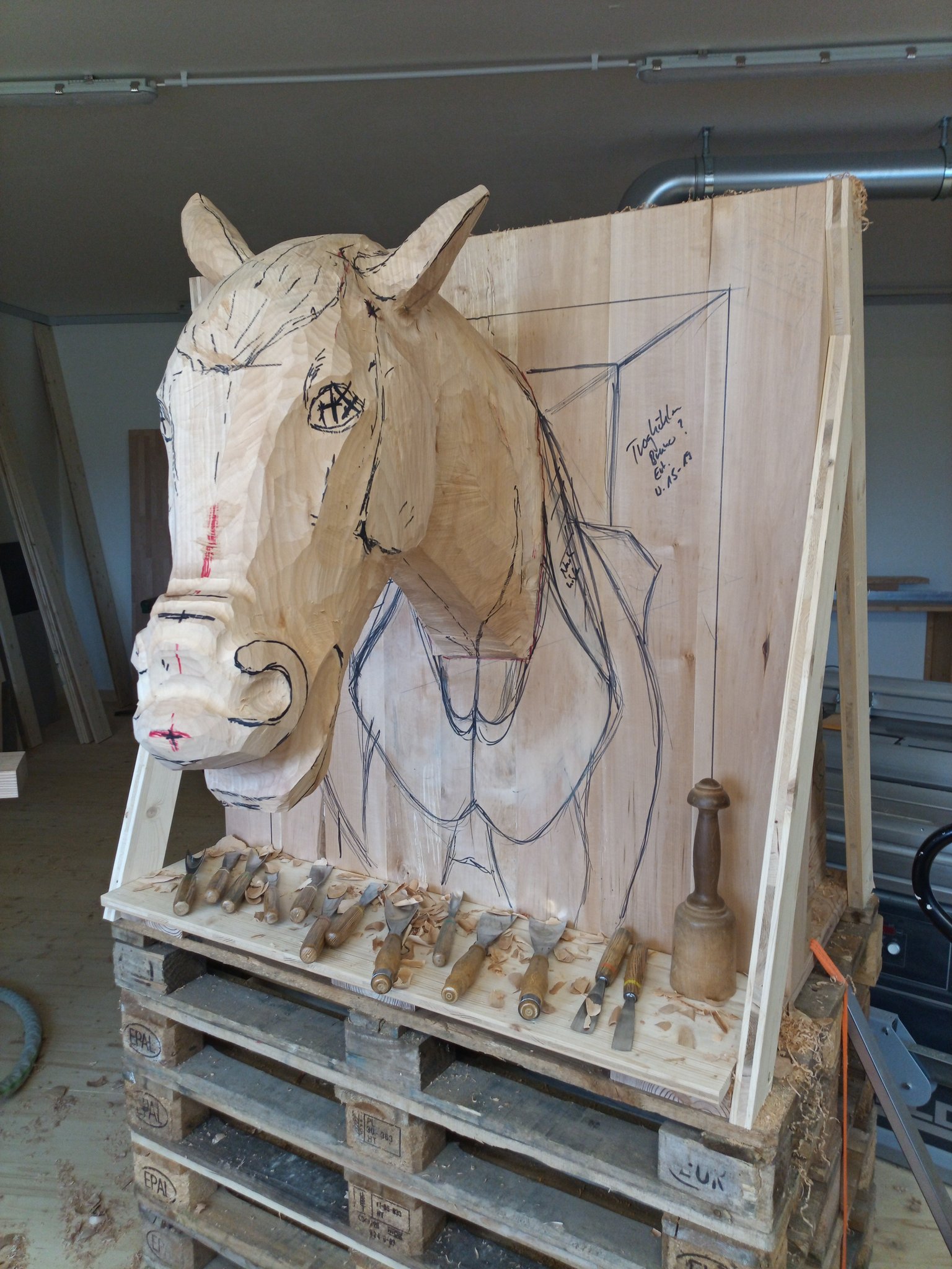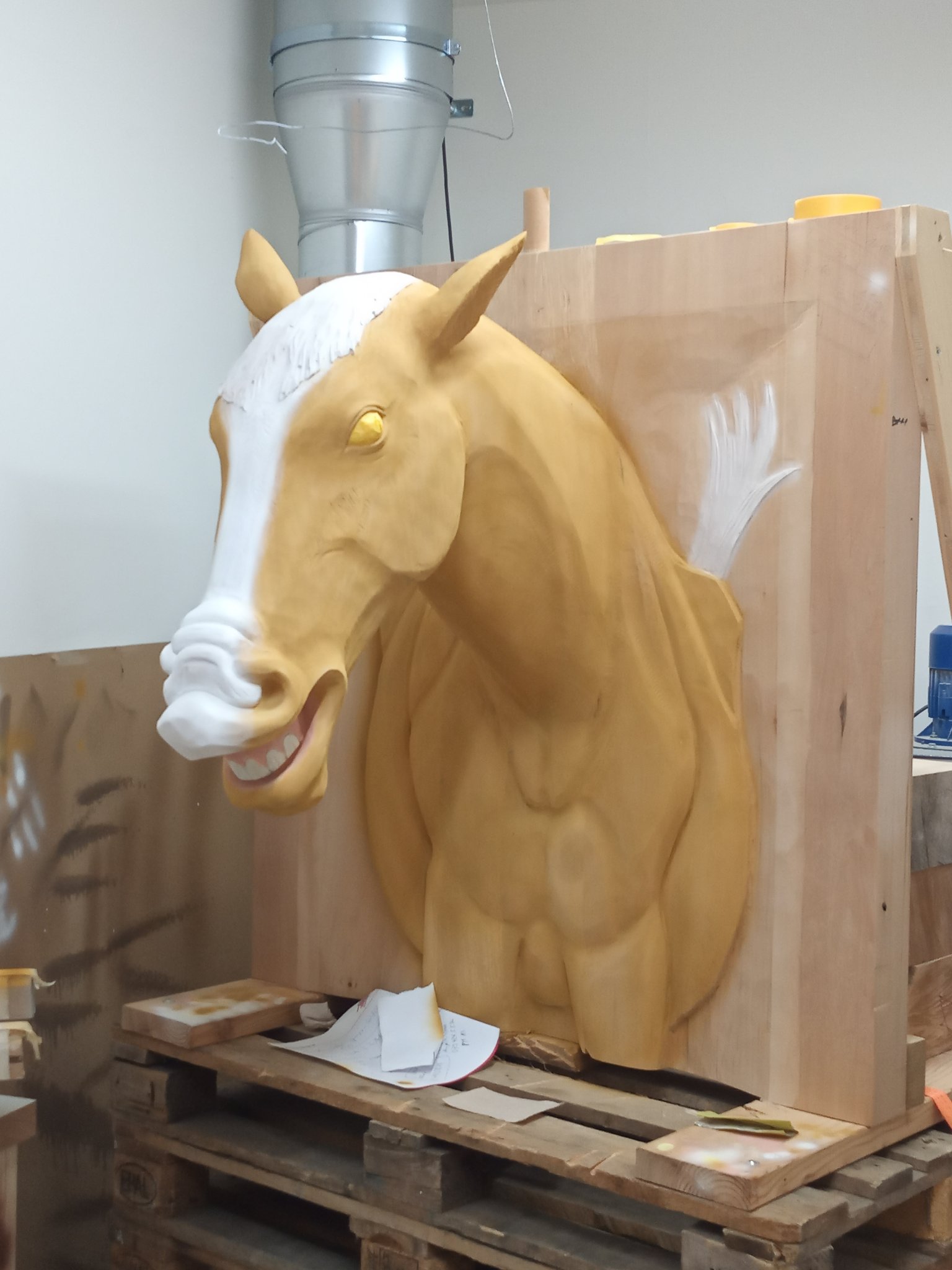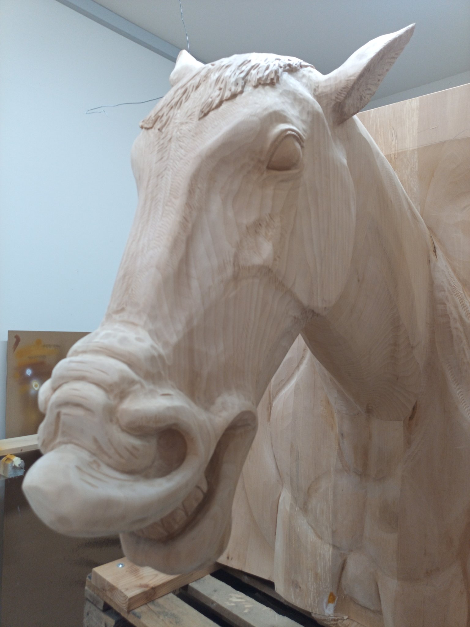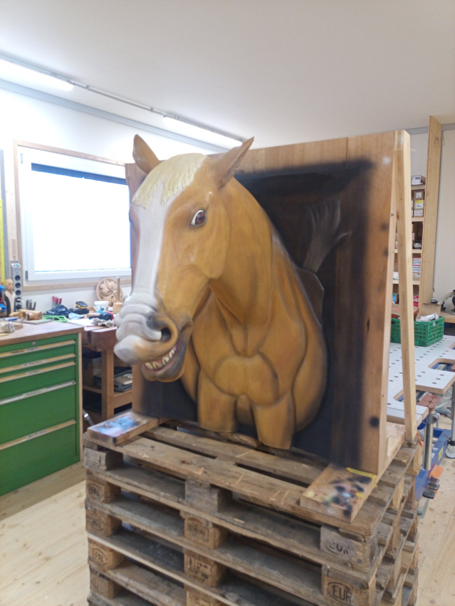Die lebensgrosse Pferdebüste wurde aus verleimten Lindeholz geschnitzt und anschliessend mit Spritzpistole und Airbrush naturalistisch bemalt.