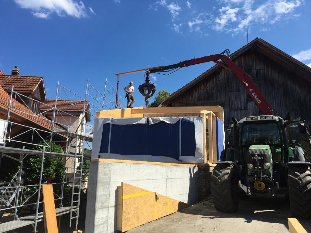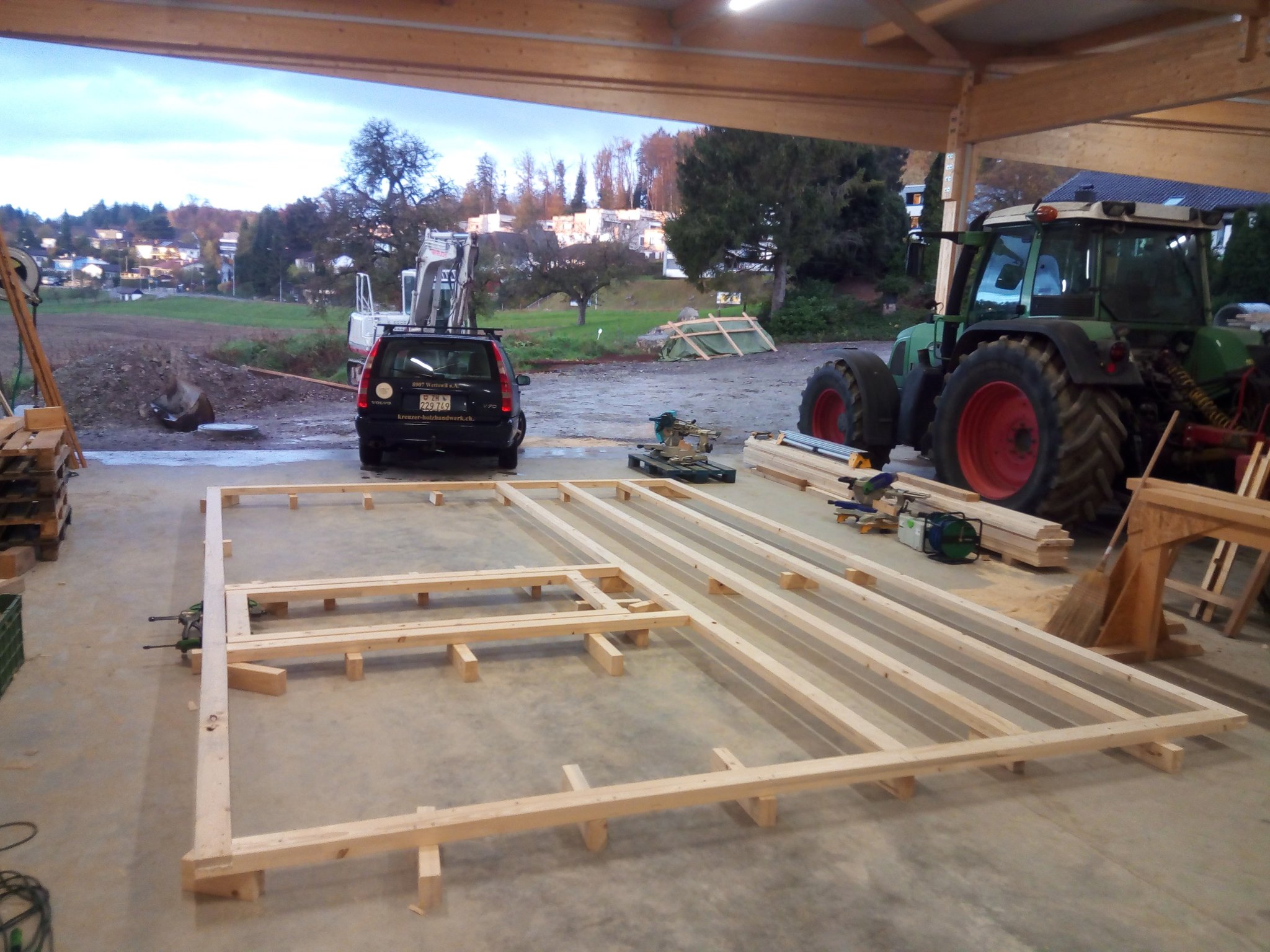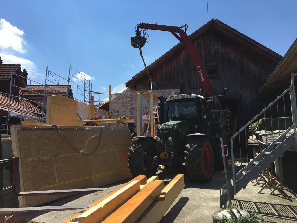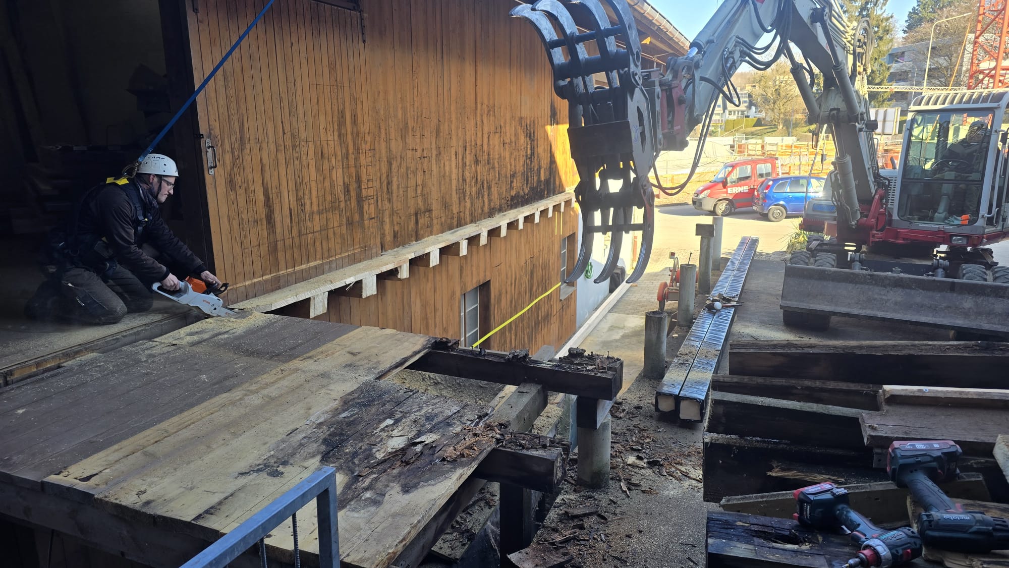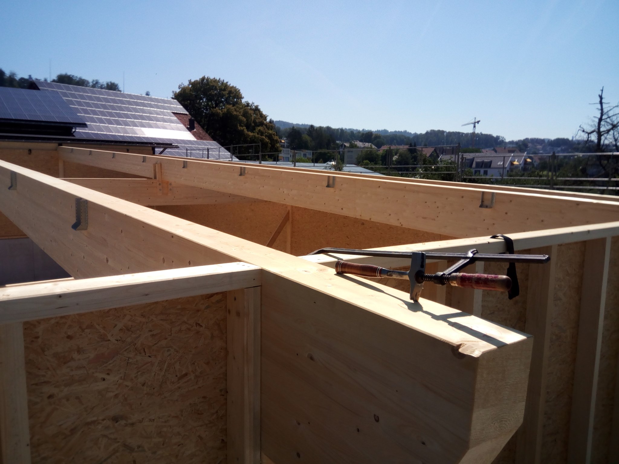 Ich erarbeitete in Zusammenarbeit mit dem Bauherrn einen Entwurf für den Neubau aus und setzte ihn danach um. Der alte und morsche Boden wurde durch Hohlkastenelemente ersetzt. Die Wände wurden in Elementbauweise geplant und erstellt. Danach folgte der Dachstuhl, welchen wir konventionell aufgerichtet haben. Dank einer guten Planung und Arbeitsvorbereitung verging vom Abbruch des alten Obergeschoss übers Erstellen der neuen Wandelemente bis hin zum Aufrichten des Dachstuhls und Verlegen des Unterdachs nur gerade vier Tage.
