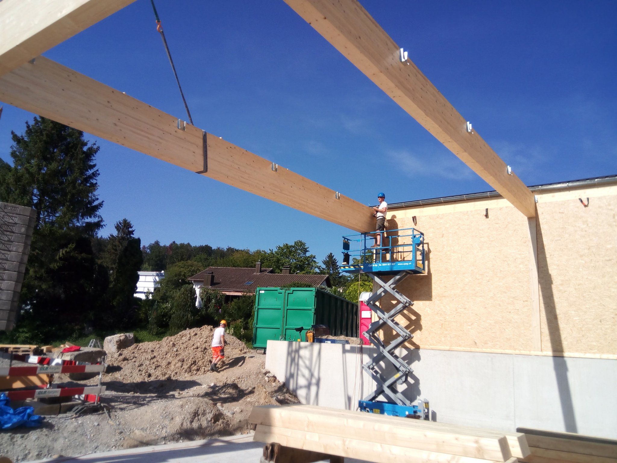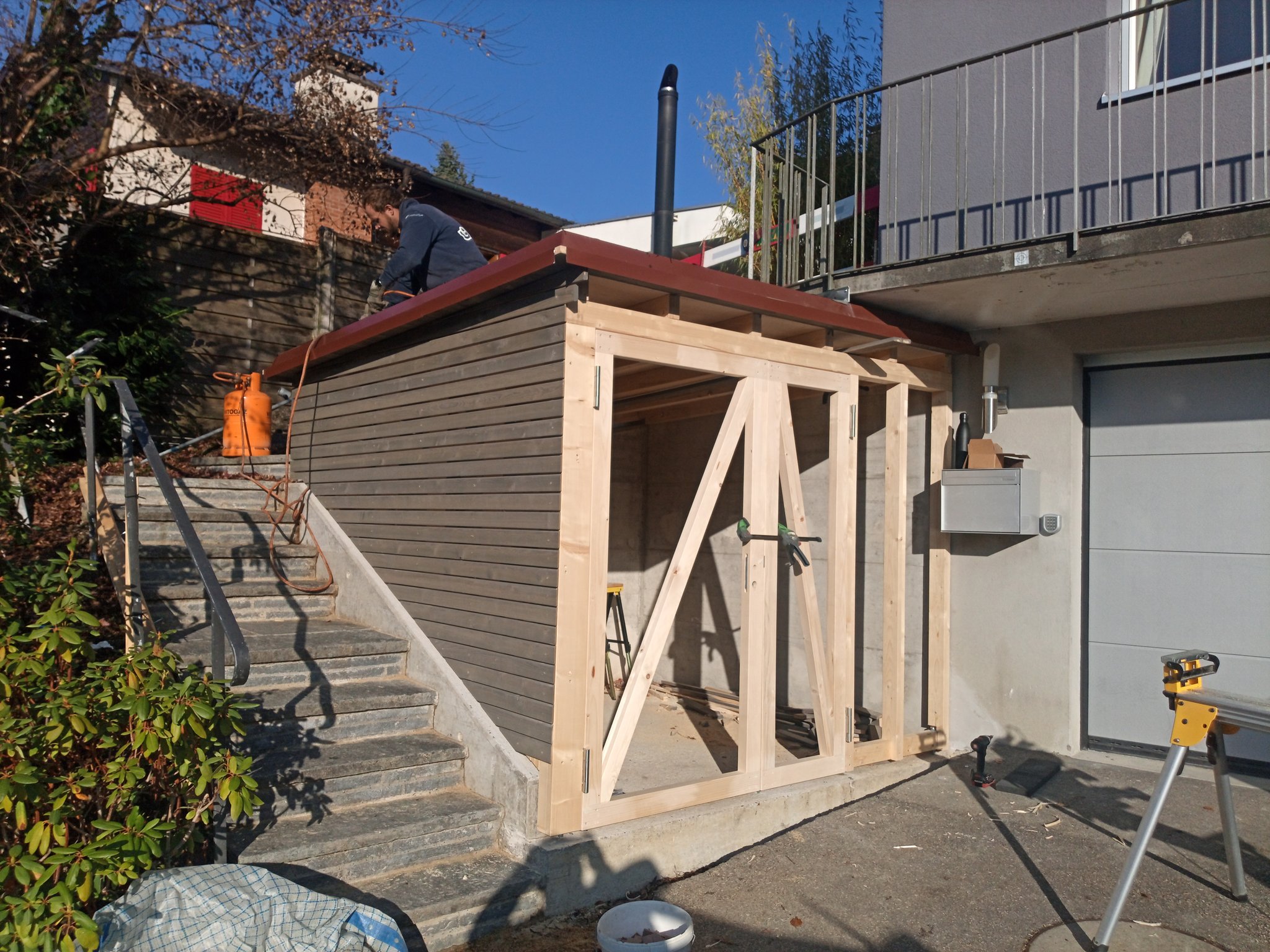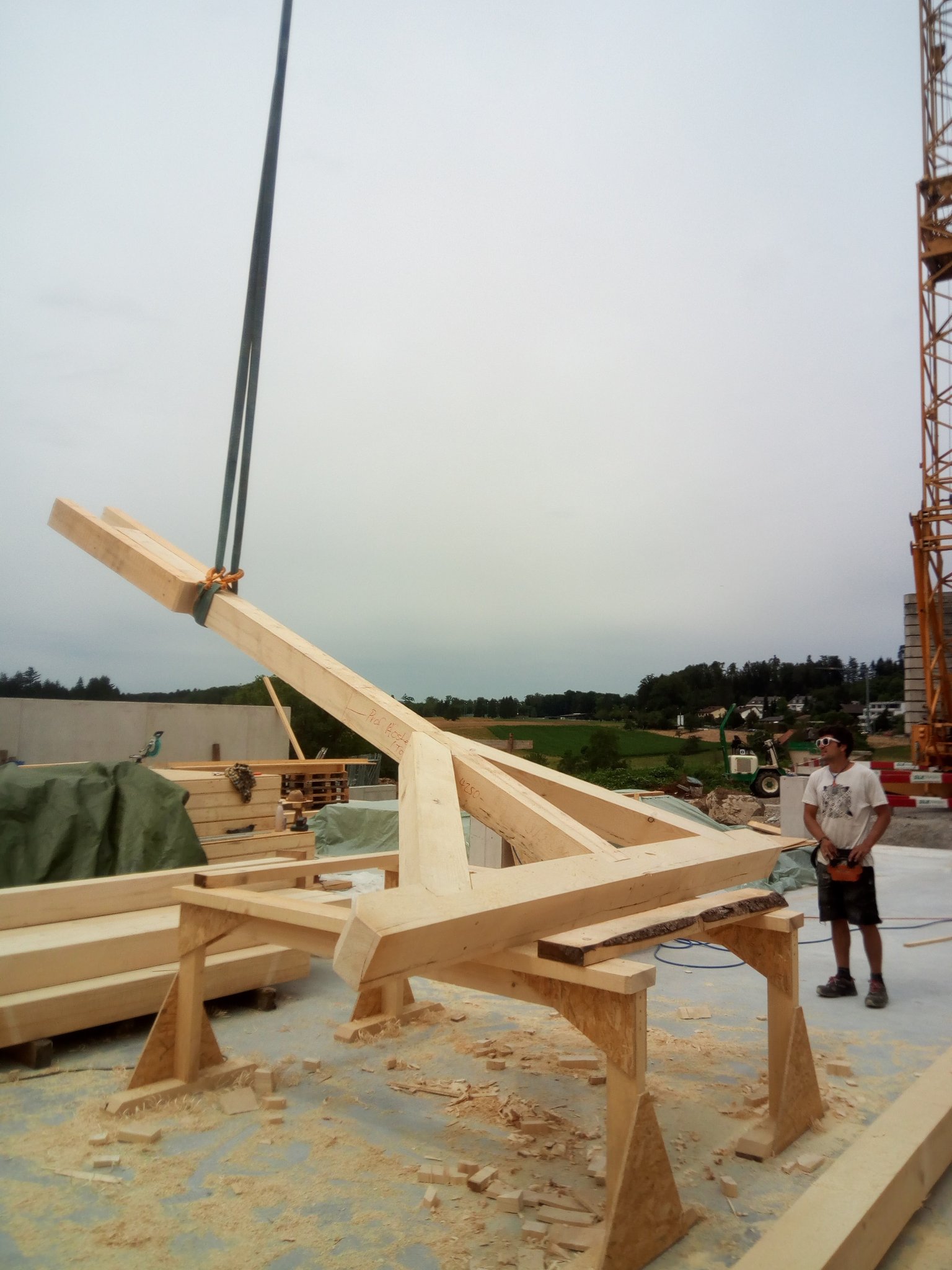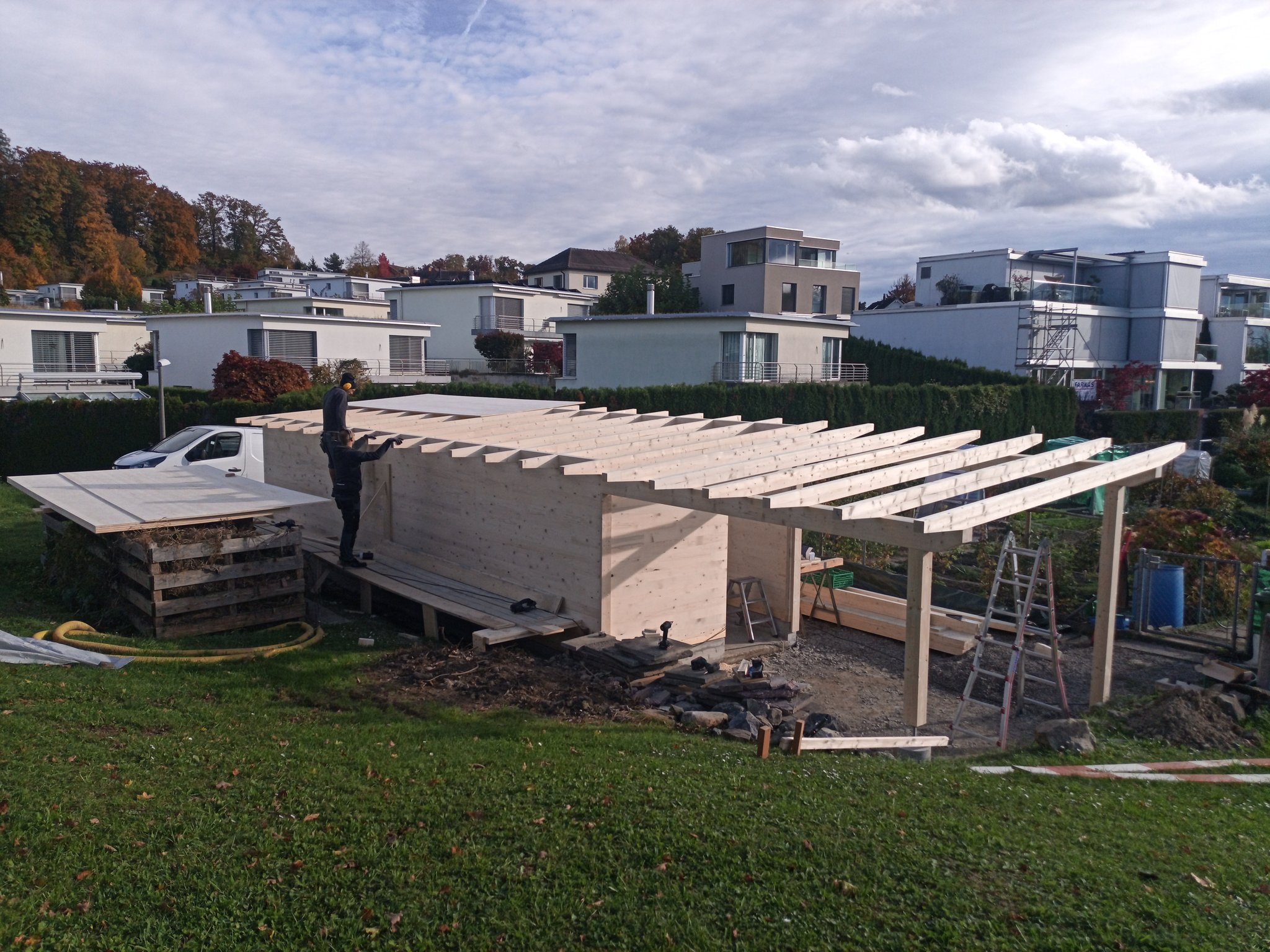 Ich erarbeitete in Zusammenarbeit mit dem Bauherrn einen Entwurf für den Neubau aus und setzte ihn danach um. Der alte und morsche Boden wurde durch Hohlkastenelemente ersetzt. Die Wände wurden in Elementbauweise geplant und erstellt. Danach folgte der Dachstuhl, welchen wir konventionell aufgerichtet haben. Dank einer guten Planung und Arbeitsvorbereitung verging vom Abbruch des alten Obergeschoss übers Erstellen der neuen Wandelemente bis hin zum Aufrichten des Dachstuhls und Verlegen des Unterdachs nur gerade vier Tage.