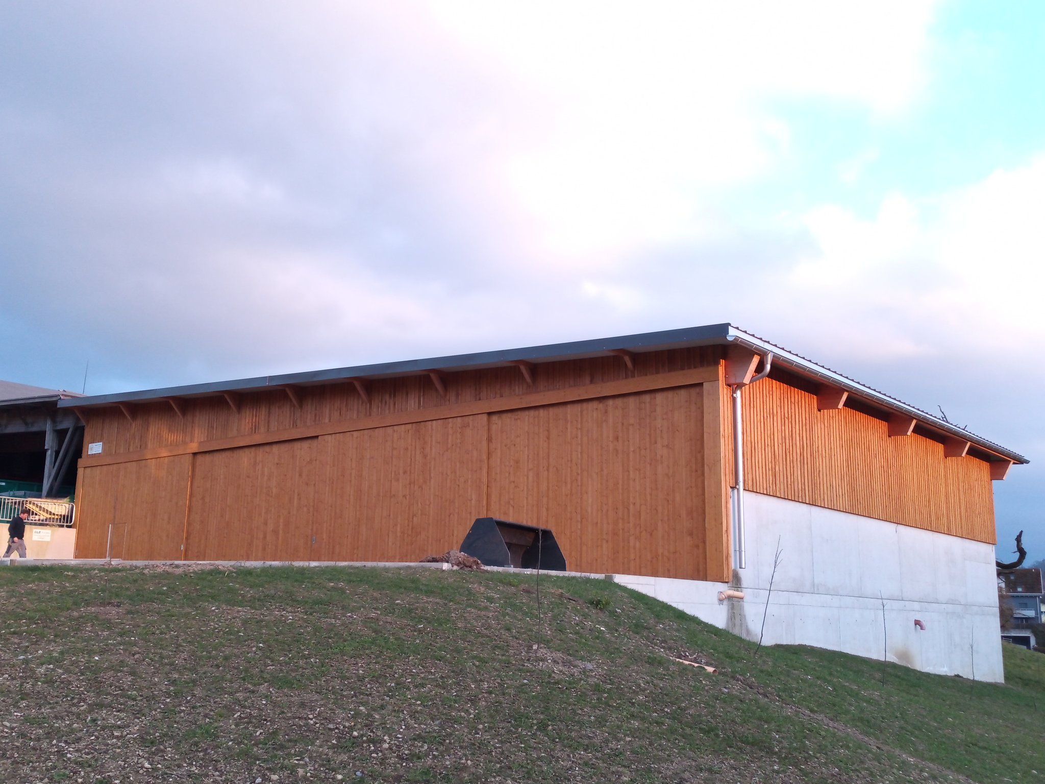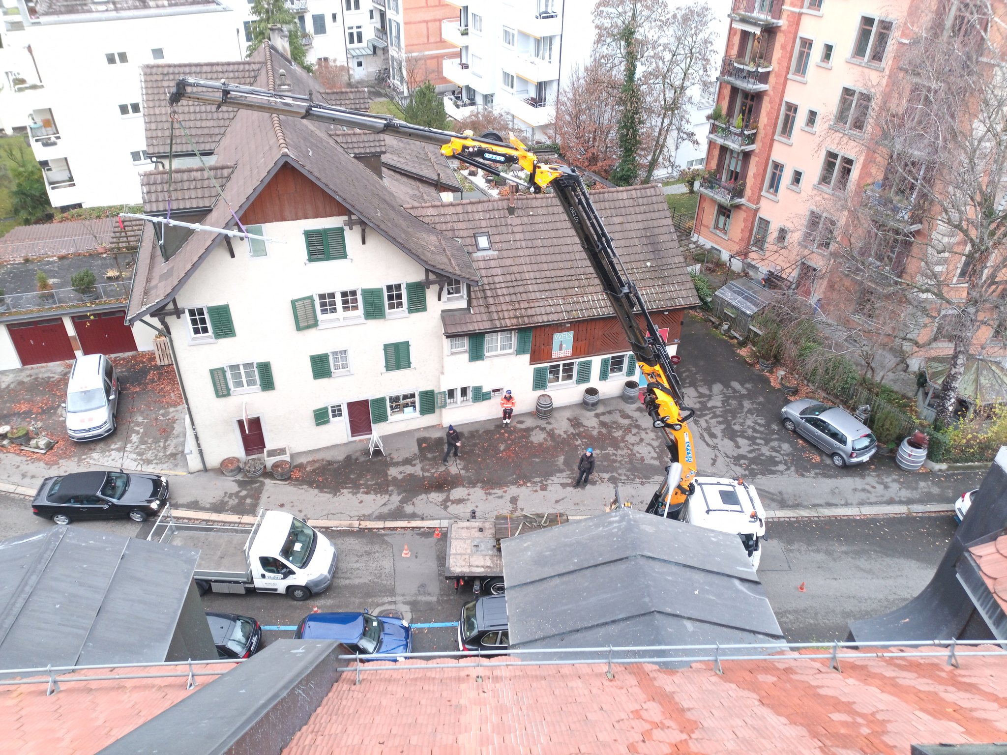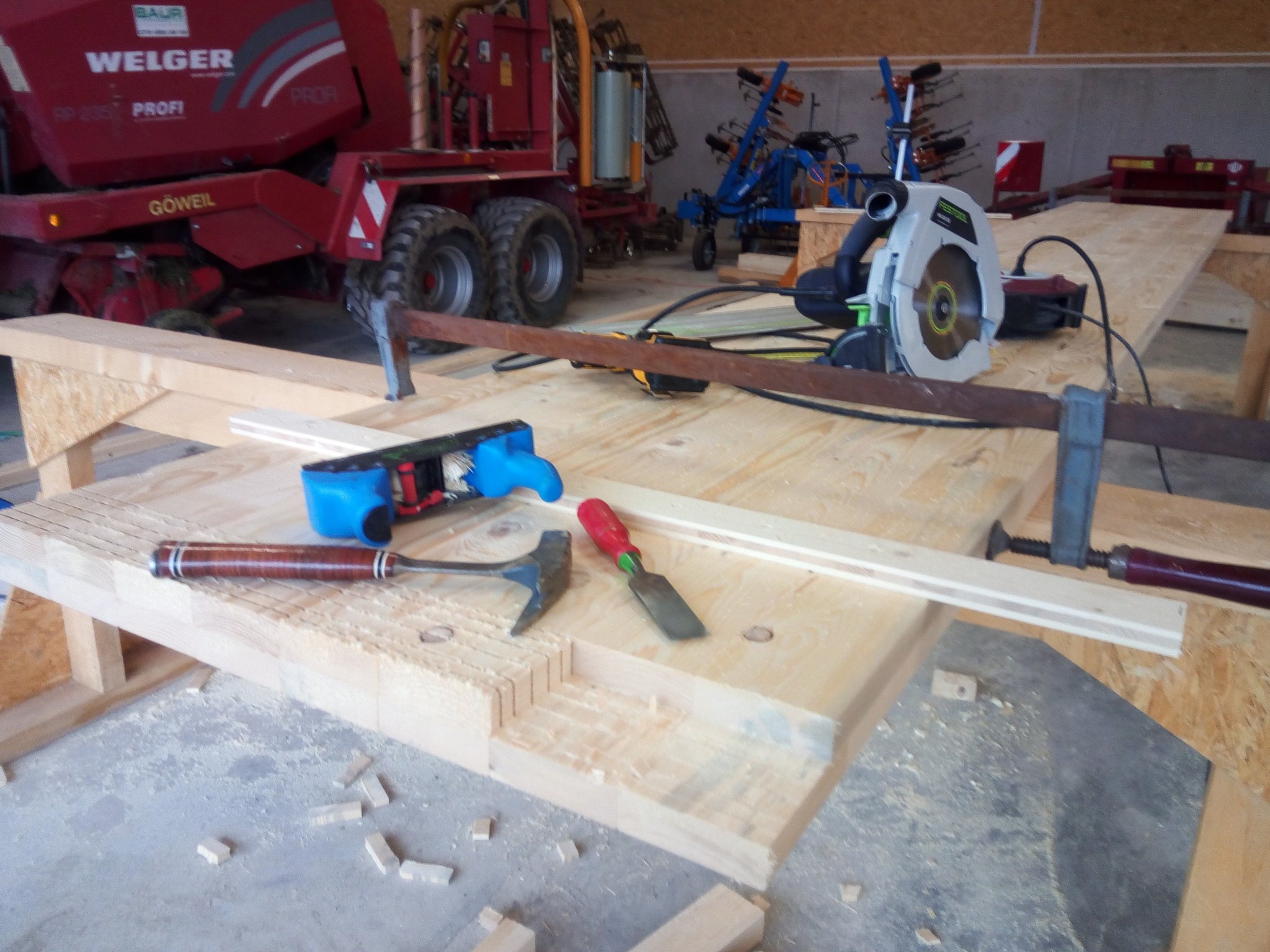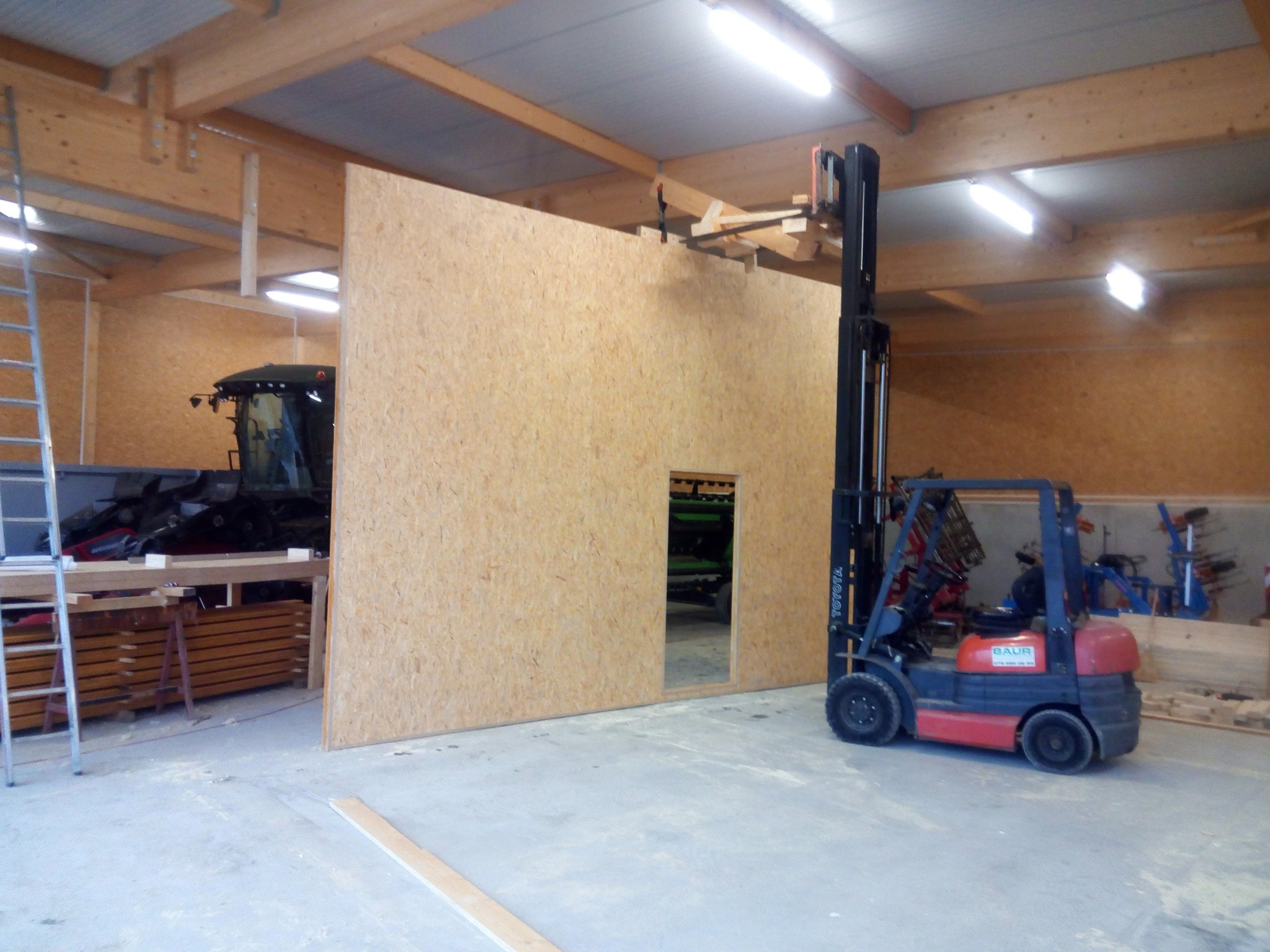 Ich erarbeitete in Zusammenarbeit mit dem Bauherrn einen Entwurf für den Neubau aus und setzte ihn danach um. Der alte und morsche Boden wurde durch Hohlkastenelemente ersetzt. Die Wände wurden in Elementbauweise geplant und erstellt. Danach folgte der Dachstuhl, welchen wir konventionell aufgerichtet haben. Dank einer guten Planung und Arbeitsvorbereitung verging vom Abbruch des alten Obergeschoss übers Erstellen der neuen Wandelemente bis hin zum Aufrichten des Dachstuhls und Verlegen des Unterdachs nur gerade vier Tage.