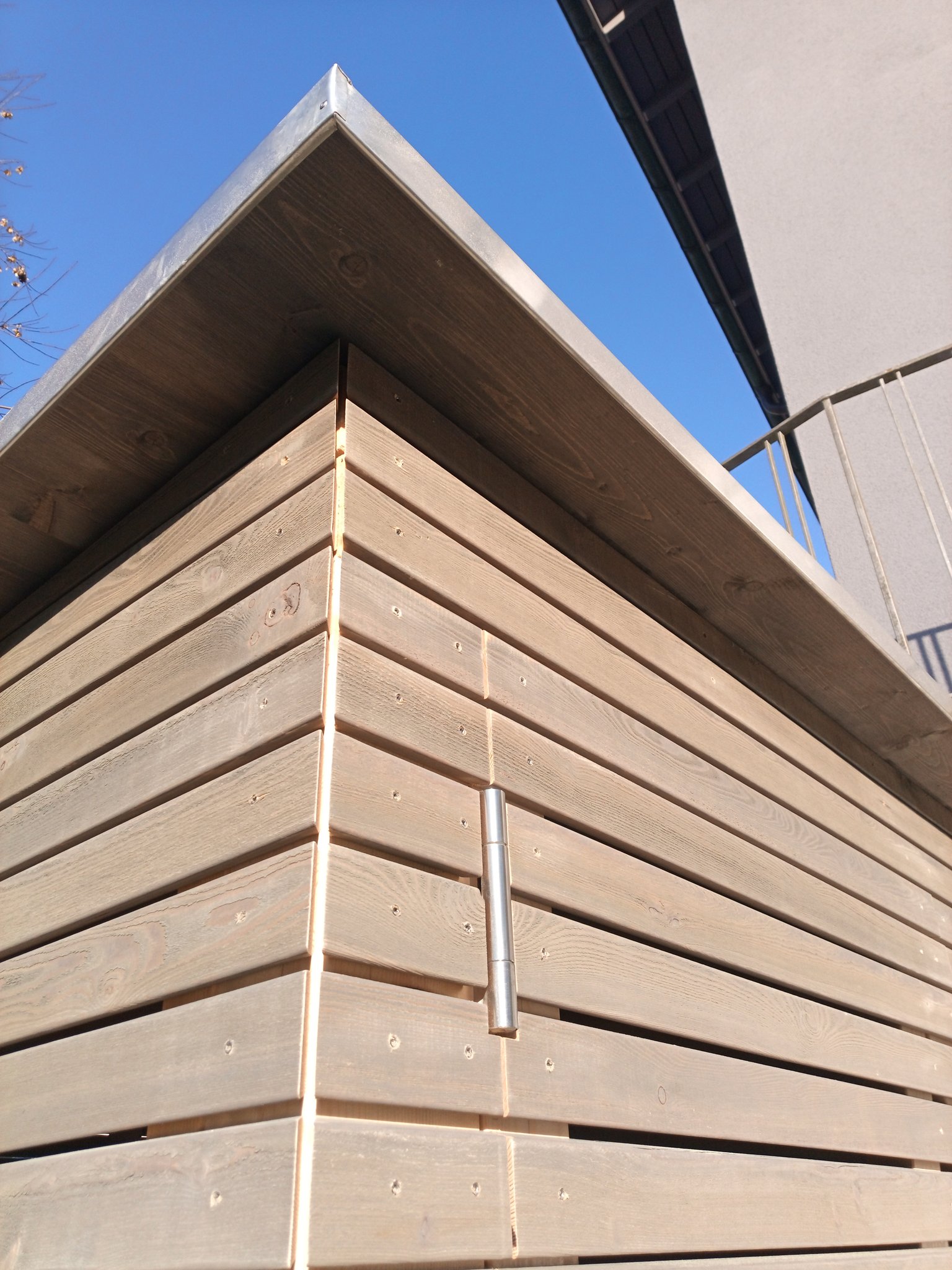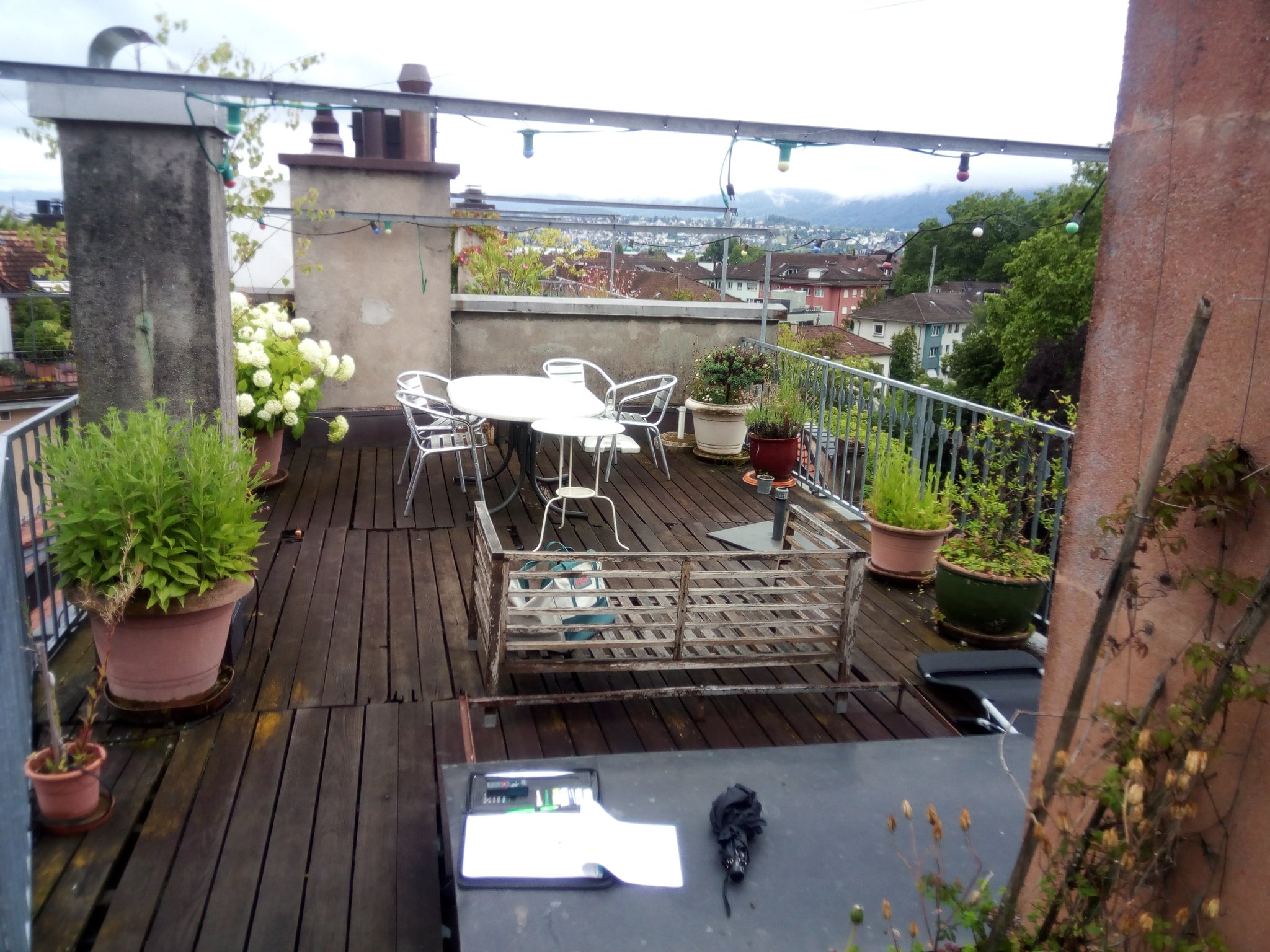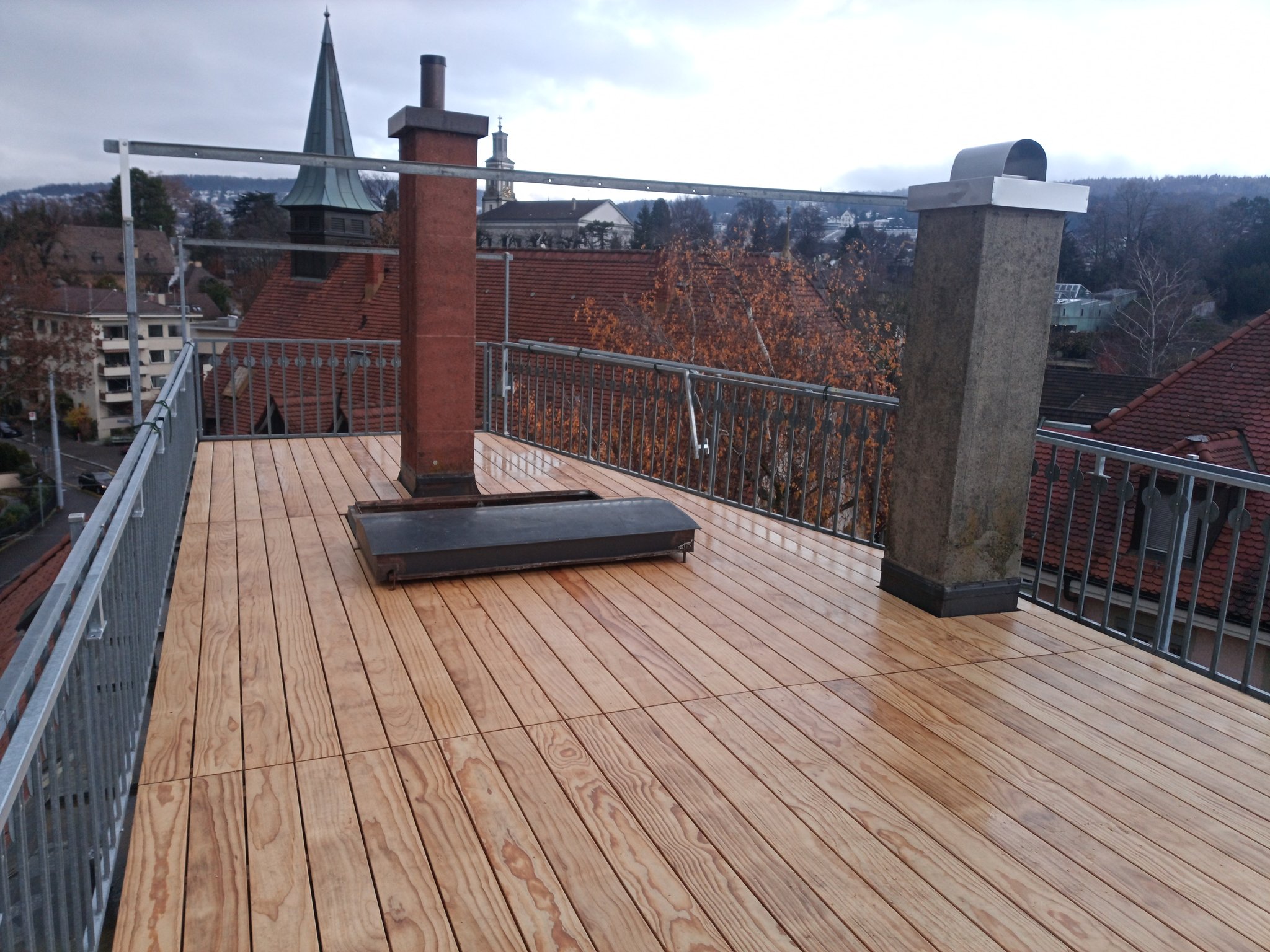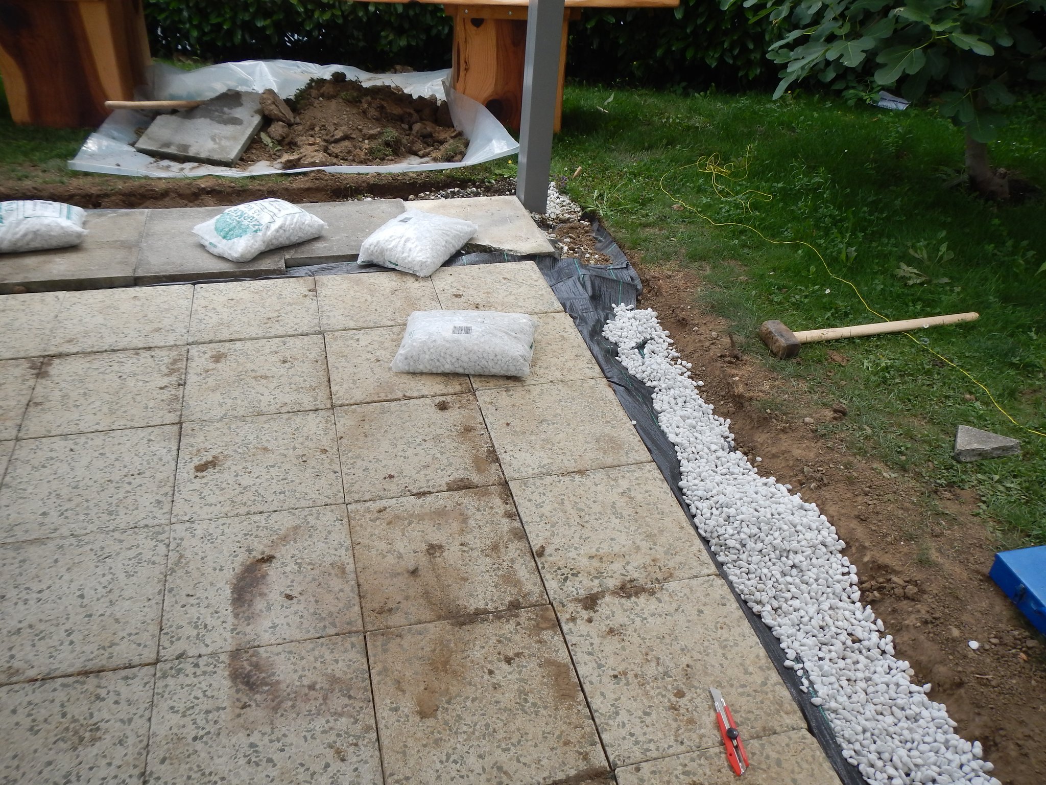 Die bestehenden Gartenplatten dienten dabei optimal als Fundament und Krautschutz für die darauf gesetzte Unterkonstruktion und den Deckbelag. Im Übergangsbereich zwischen Gartenplatten und Rasen wurde ein Wurzelschutzvlies eingesetzt, welches in der Zierkiesumrandung endet.